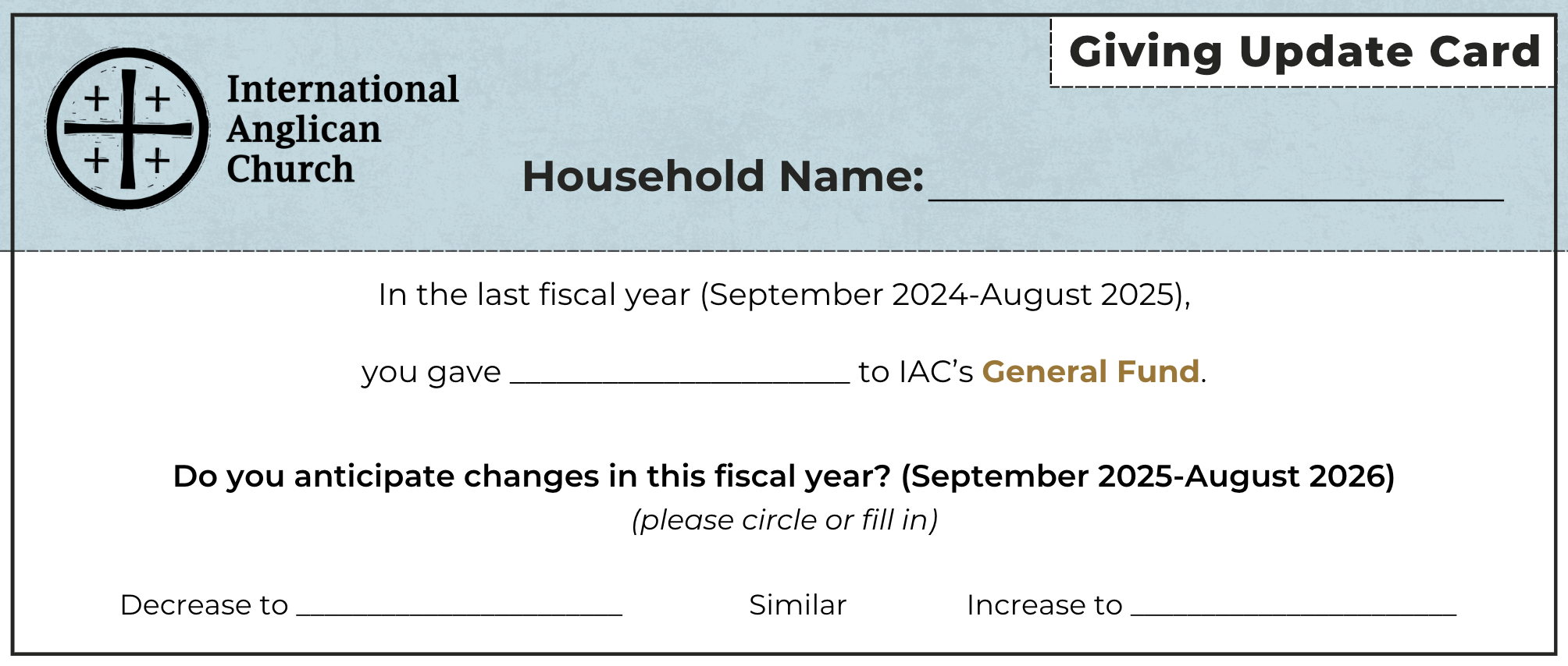On the front side of the card you’ll find a summary of your giving to IAC's General Fund last fiscal year, as well as an opportunity to say whether those gifts will be increasing, decreasing, or staying the same. We are fully aware that we don't know everything going on in your life and relationship with God, and we trust you to ask God and discern what would be best in your giving for the coming year!
