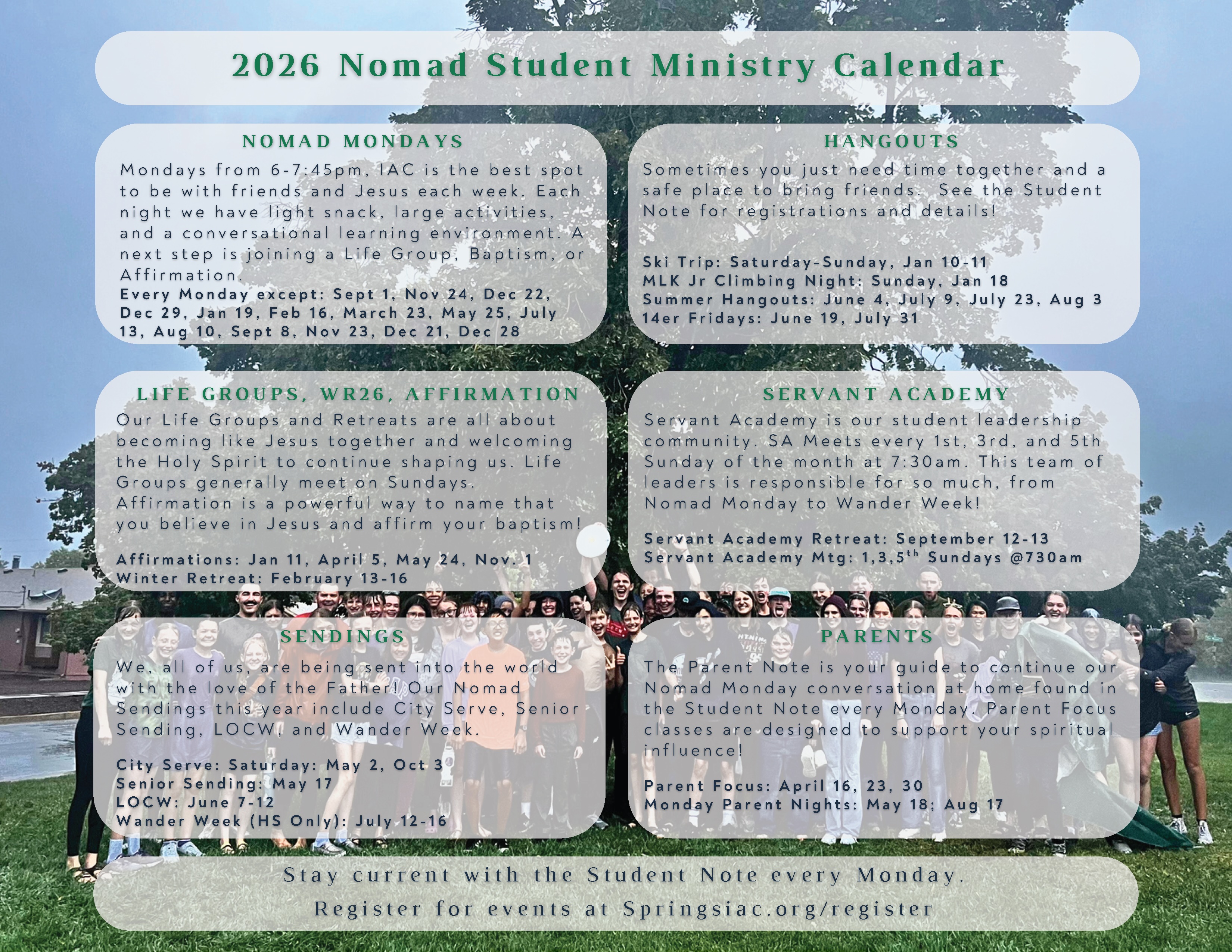 Mondays from 6 to 7:45 at IAC – Nomad Monday’s are for students 7-12th grade for friends, Jesus, and laughter. Snacks, adventurous somethings, worship, and hanging out. More info at springsiac.org/register.